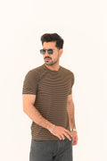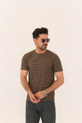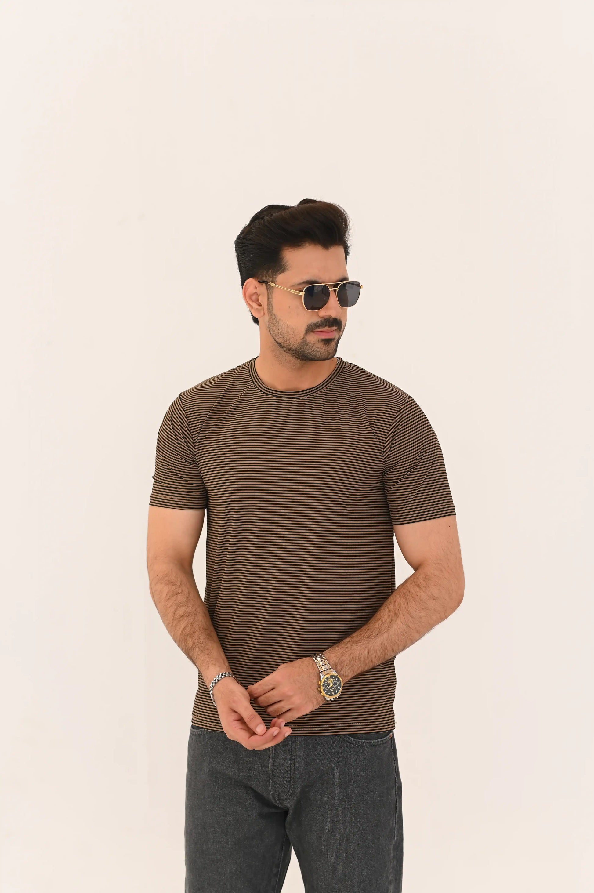 Unisex Brown & Black Micro-Stripe Crew Neck T-Shirt – Premium Imported Stretch Fabric